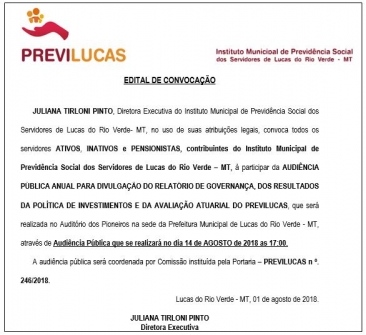 A Diretora Executiva do PREVILUCAS, convoca todos os segurados do Instituto Municipal de Previdência Social dos Servidores de Lucas do Rio Verde, a participarem da audiência pública que acontecerá dia