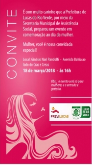 Convidamos todas as servidoras do Município de Lucas do Rio Verde, em especial todas as aposentadas por este Instituto de Previdência, para participar do evento em comemoração ao dia da mulher que aco