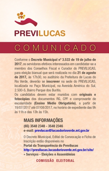 Está aberto o período de Inscrições para servidores ATIVOS e INATIVOS contribuintes do Instituto Municipal de Previdência Social dos Servidores de Lucas do Rio Verde - MT que tiverem interesse em se candidatar para a ELEIÇÃO DOS CONSELHOS CURADOR E FISCAL DO PREVILUCAS, que será realizada no auditório dos Pioneiros na sede da Prefeitura Municipal de Lucas do Rio Verde - MT, através de Assembléia Geral que se realizará no dia 21 de AGOSTO de 2017. Na ocasião serão eleitos 04 membros para compor o Conselho Curador do PREVILUCAS, sendo 02 titulares e 02 suplentes; 04 membros para compor o Conselho Fiscal do PREVILUCAS sendo 02 titulares e 02 suplentes. Também ocorrerá a prestação de contas do Primeiro Semestre do ano de 2017.