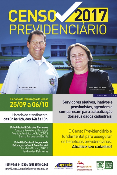O Censo acontecerá entre os dias 25/09/2017 a 06/10/2017 e o agendamento poderá ser efetuado através do site previlucas.lucasdorioverde.mt.gov.br. Neste link o segurado poderá escolher o horário e um dos pólo de atendimento.