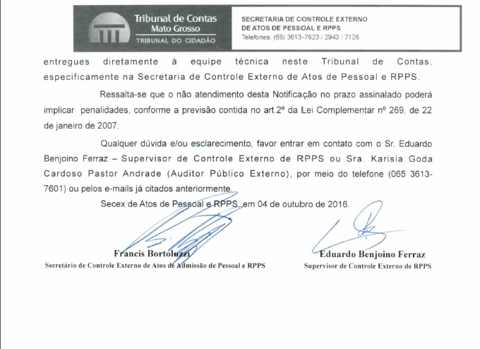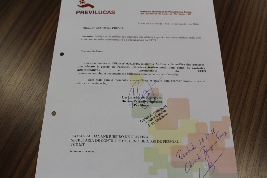 A equipe administrativa do Previlucas teve o prazo de 15 dias para encaminhar os documentos solicitados, onde organizou o processo com toda documentação, sendo protocolada na sede do tribunal de contas em 20 de outubro de 2016.