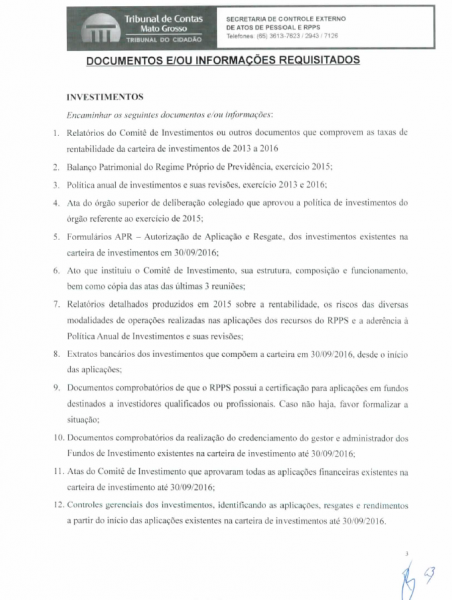 Na data de 04 de outubro de 2016, o Previlucas, recebeu via Oficio nº 33/2016 expedido pelo Tribunal de Contas do estado do Mato Grosso, informações de que seria realizado auditoria no setor de Investimentos do Previlucas, com intuito de analisar questões relacionadas à gestão, estrutura institucional, bem como aos controles administrativos e operacionais do Regime Próprio de Previdência Social (RPPS).