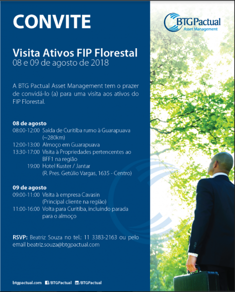 O BTG Pactual possui expertise com mais de 30 anos de experiência, com histórico de boa estruturação e condução dos investimentos no setor, administrando atualmente mais de 700.000 hectares de propriedades florestais na América Latina, Estados Unidos, Europa e África, com cerca de US$ 3 bilhões em ativos e capital comprometido.