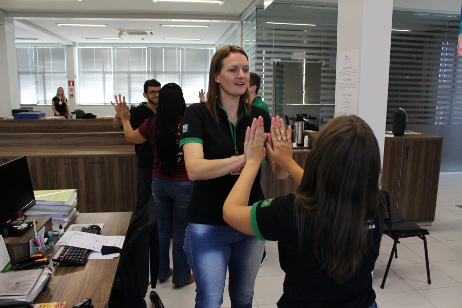 Com o auxílio do terapeuta ocupacional Sr. Ramão Américo Godoy, os servidores tiveram 15 minutos de exercícios que ajudam a previnir as lesões por esforço repetitivo – LER.
