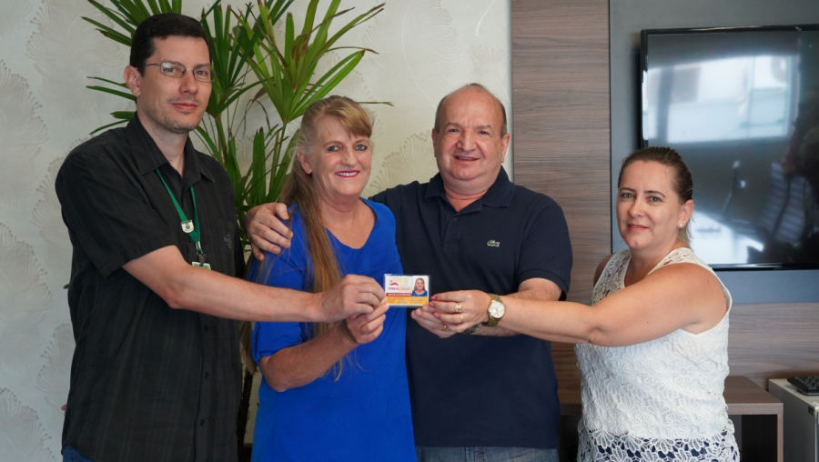 Julita recebeu a carteirinha de aposentado do Previlucas e foi homenageada pela equipe da Secretaria Municipal de Saúde com flores e uma lembrança.
