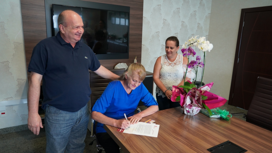 Nesta sexta-feira (21), o prefeito Luiz Binotti e o Previlucas entregaram o cartão e a documentação de aposentadoria à servidora mais antiga da prefeitura. Julita Maria Ferst se aposentou hoje com 29 anos e dois meses de tempo de serviço.
